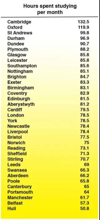 再瞅瞅榜单的另一端,赫尔大学学生每个月只有50个小时用于专业学习。