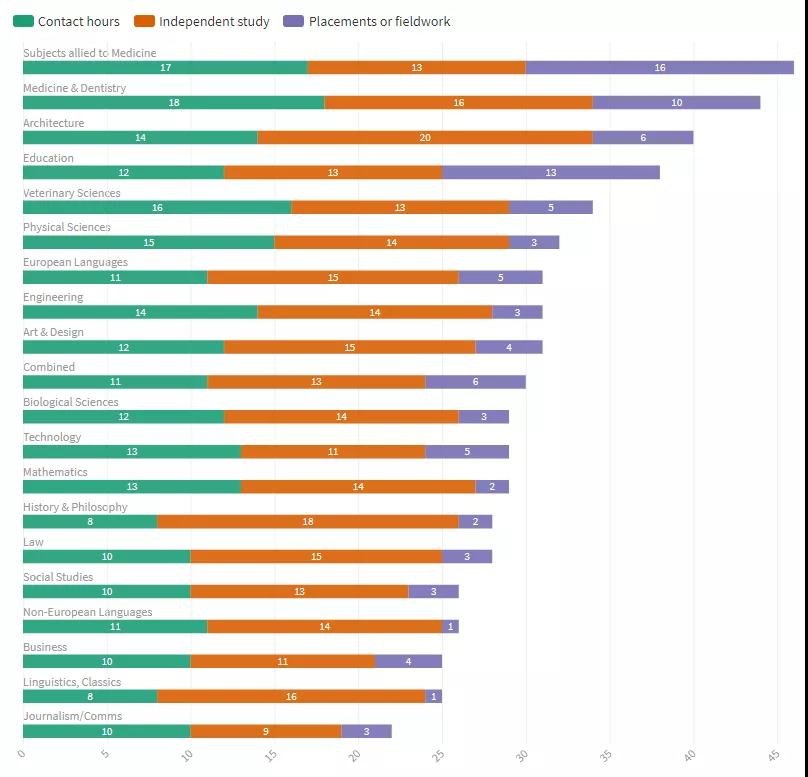 你的专业每周平均学习时间多少呢? (contact hours:课时 Inepenent stuy:独立学习时间 Placement or fielwork: 实习或实地考察)