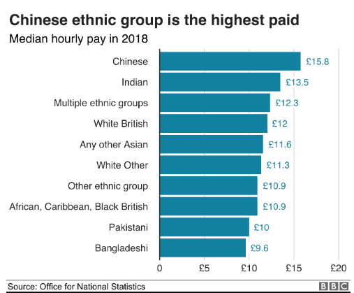 英国国家统计局有关以不同种族角度研究工资差距的数据显示,除中印外所有其它族裔的平均工资都低于白人员工。