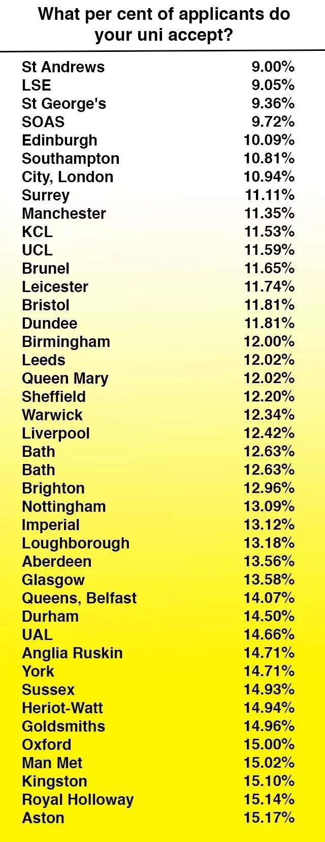 在这个榜单中,第一名是 圣安德鲁斯大学 ,录取率只有9%, 紧随其后的是LSE,只录取了9.05%的申请者,以微弱差距惜败圣安,排在了第二位。同样位于伦敦的St George's和Soas也挤进了top4。这4所学校的录取率均低于10%。