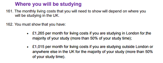 - 关于存多少钱:用来申请Tier 4签证的存款金额是需要存1年学费+9个月生活费,如果学费已经全部交清,只需存9个月的生活费即可。按照英国移民局的要求,伦敦地区1个月的生活费约为£1,265,9个月则约为£11,385。外伦敦地区1个月的生活费约为£1,015,9个月则约为£9,135,大家可以在官方Tier4说明材料上找到(第44页)。学费可以从学校发来的Offer或者CAS Letter上看到。
