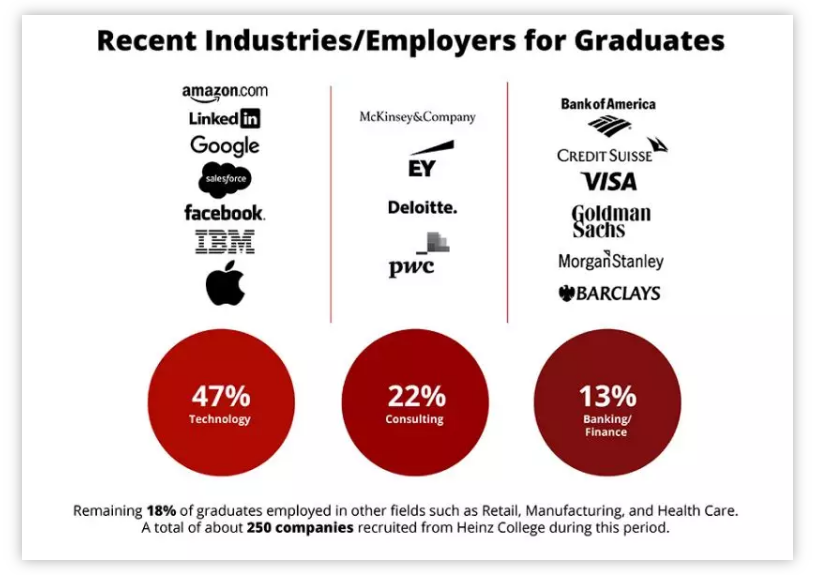 我们可以来看一下CMU官网上的这个数据,CMU的MIS毕业生有: 47%进入了技术行业, 22% 进入了咨询行业,33%进入了银行、金融行业。 他们去向的公司有 领英、谷歌、亚马逊 等互联网巨头;也有 麦肯锡、安永、德勤 等知名咨询公司,还有 摩根士丹利 这样的顶级投行……