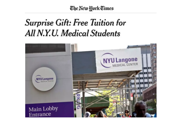 就在去年暑假,纽约大学传来了极其振奋人心的消息:医学生的学费将被全额免除。