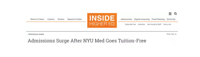 鉴于越来越多的学生因为担心背上债务而放弃梦想,不去从医,NYU医学院决定免除学生学费, 让更多出身贫寒的学生能够有机会实现自己的人生理想,学校认为这是自己应尽的“道德义务” 。