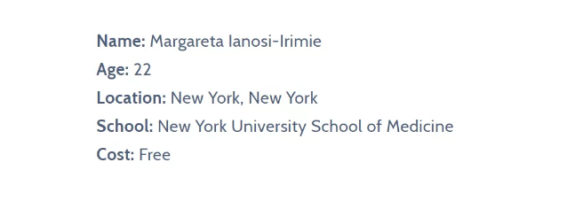 玛格丽塔今年22岁,本科就读于马萨诸塞大学安姆斯特分校(the University of Massachusetts Amherst),去年秋季正式被NYU医学院录取。