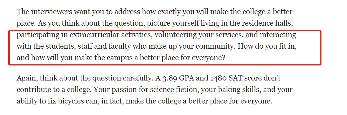 在文书中和在面试的时候经常会遇到的一个问题是what o you think U will contribute to you course/college? 这个问题应该怎么回答?学校并不是要一个高G点或者SAT分数的学生,而是需要你真的有某些特长,质素能够帮助你的学校成为一个更好的地方,这些出发点可以来自跟同学相处,教同学吉他,有烘焙的小技能会谱曲写歌等等~所以你认真思考过这个问题吗?你的contribution是什么?