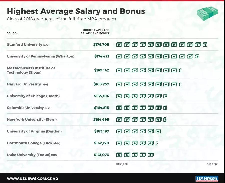 MBA 通常是大型企业管理岗的敲门砖,薪水也比商科学士学位高。据 U.S.News 统计全美 130个全日制 MBA 项目,2018年毕业生的平均工资为 $102,495 ,而 Top 12 最佳商学院出身的学生,平均工资高达 $166,999。