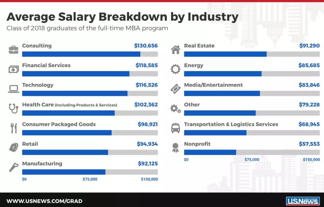 MBA 薪酬不仅取决于从哪里毕业的,还取决于选择什么行业。据调查,进入咨询行业的 MBA 毕业生薪水最高,而在非盈利行业工作的毕业生的薪水最低,只有 $57,553,咨询行业的毕业生工资比非盈利行业高出 $73,000 。