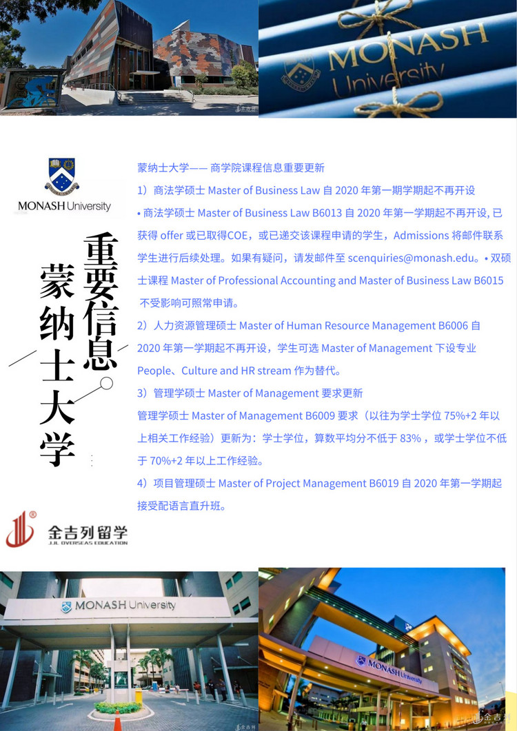 1 )商法学硕士 Master of Business Law 自 2020 年第一期学期起不再开设 , 已经拿到 COE 的学生,学校会邮件联系学生,进行后续处理,如有疑问,也可邮件 'scenquiries@monash.eu' 进行询问;