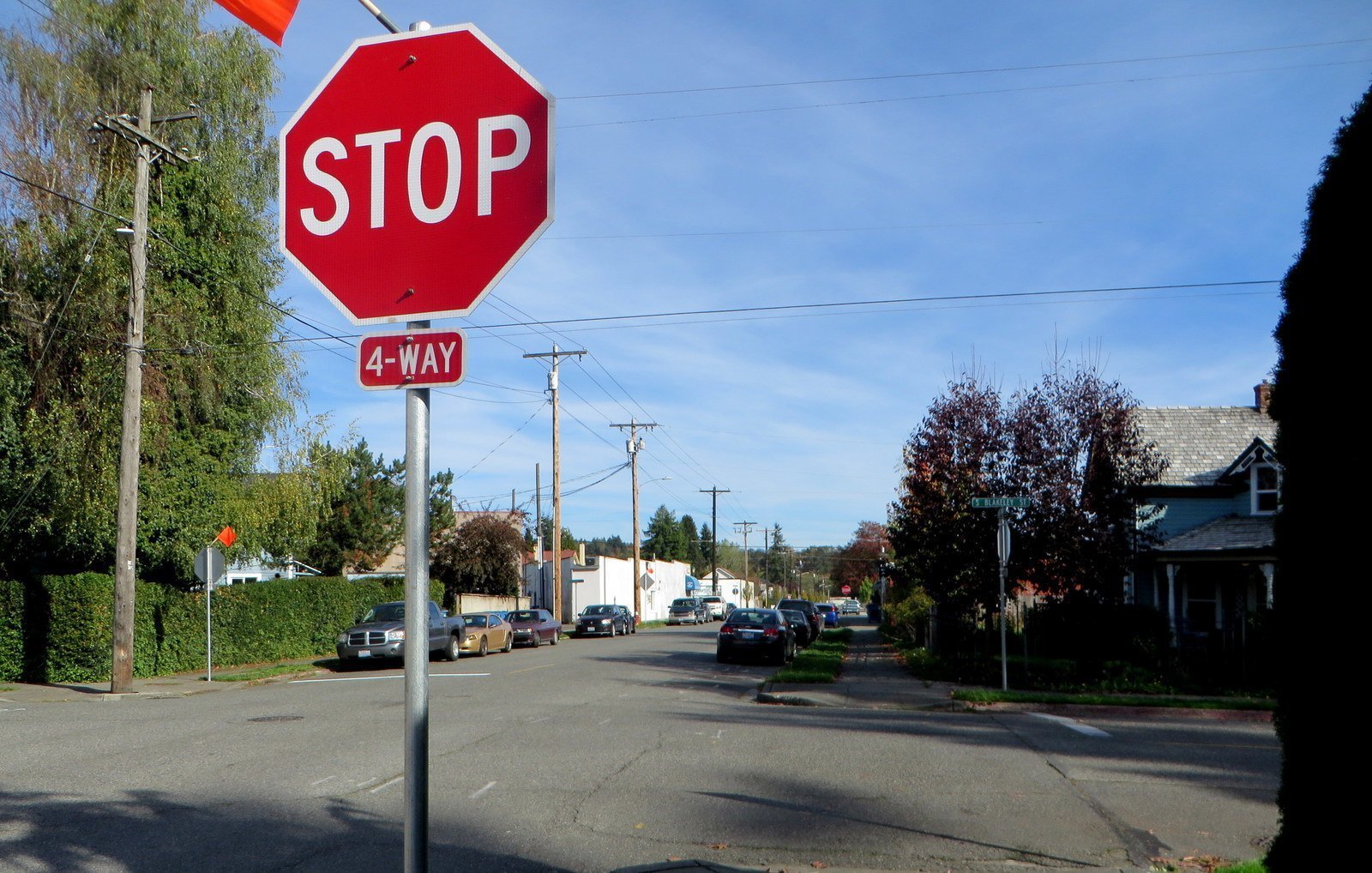 Stop Sign 有着替代红绿灯的作用,一般出现在人流量没那么多的路口。当你开到 Stop Sign 路口时,必须先 「停车」3秒(踩死刹车) ,确认十字路口有无行人车辆再行驶。若有行人车辆,一定要先让行人通行,车辆则是先来后到的原则(先到先走、后到后走,排队的概念)。