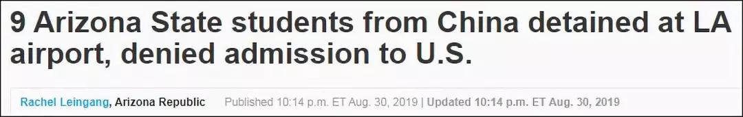 9名中国留学生在洛杉矶机场被扣、拒绝入境美国 《今日美国》报道截图 据《今日美国》8月30日报道,亚利桑那州立大学当天发表声明,确认该校9名返校学生过去一周来被拒绝进入美国。 这些学生均是本科生,其中一人即将毕业。 他们在洛杉矶国际机场(LAX)入境时遭扣留,还被搜查了随身电子设备。