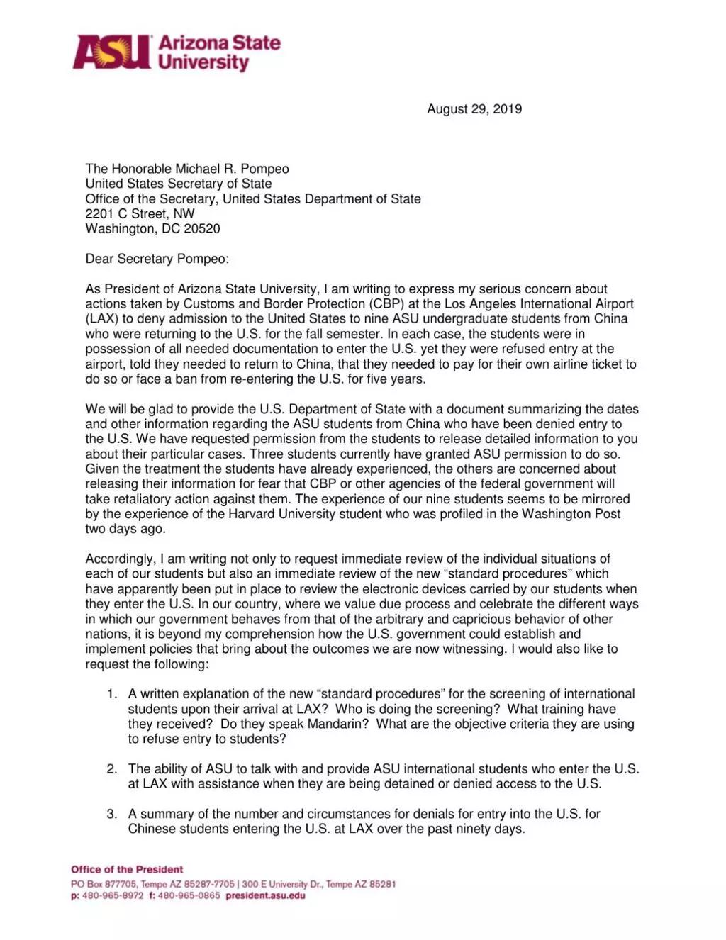 “事实上,海关及边境保护局未能提供关于事情经过的任何信息。 ” 亚利桑那州立大学是一所公立研究型大学,拥有5个校区、2900名教师、6.6万名本科生及1.5万名研究生,是全美学生最多的大学之一。 该校在2019年QS世界排名中居第212位,US News全美排名第115。 30日当日,亚利桑那州当地媒体ABC15也得到了一份海关及边境保护局的声明,称拒绝入境是基于“入关检查过程中发现的信息”,但没有透露更多细节。 该份声明还表示, 这些学生并没有被遣返 ,但入境美国需要满足《移民与国籍法》中超过60项不同条目的条件,包括健康、犯罪、安全原因等。 被拒绝入境者依然能向国务院重新申请签证。 该媒体还援引知情人士称,海关人员疑似从学生的电子设备中发现他们雇人代写作业的证据,违反了F1学生签证的规定,因此被拒绝入境。 不过目前尚没有证据能证实这一说法。 亚利桑那州立大学发言人冈萨雷兹(Jerry Gonzalez)也对此予以否认,称学生被扣与学术诚信问题无关。 “所有学生的学业记录及签证都符合返校与入境的标准。 ” 发言人还表示, 即便存在学术不诚信行为,也应该由校方而不是海关人员决定其去留。 29日,亚利桑那州立大学校长麦克·克罗(Michael Crow)向国务卿蓬佩奥、国土安全部长麦卡利南致信,要求彻查此事。 他在信中提出四个问题,包括解释在入境时搜查学生的流程及拒绝入境的标准,过去90天里在LAX拒绝中国学生入境的前例等,要求对每个学生的个案重新评估。 “我无法理解美国政府竟能设立并执行导致眼前结果的政策。 ”他写道。 校长克罗致信国务卿蓬佩奥,要求解释搜查留学生一事 《今日美国》介绍,自特朗普上台以来,媒体已经报道了多起国际学生遭遇入境拖延或是签证出问题的事件。 8月23日,一位来自巴勒斯坦的17岁哈佛大学新生也在波士顿洛根机场被撤销签证遣返,理由是“社交媒体有朋友发表反美政治观点”。 8月27日,一名中国留学生在底特律机场入关时因携带一件防弹衣而被海关注销签证并遣返。