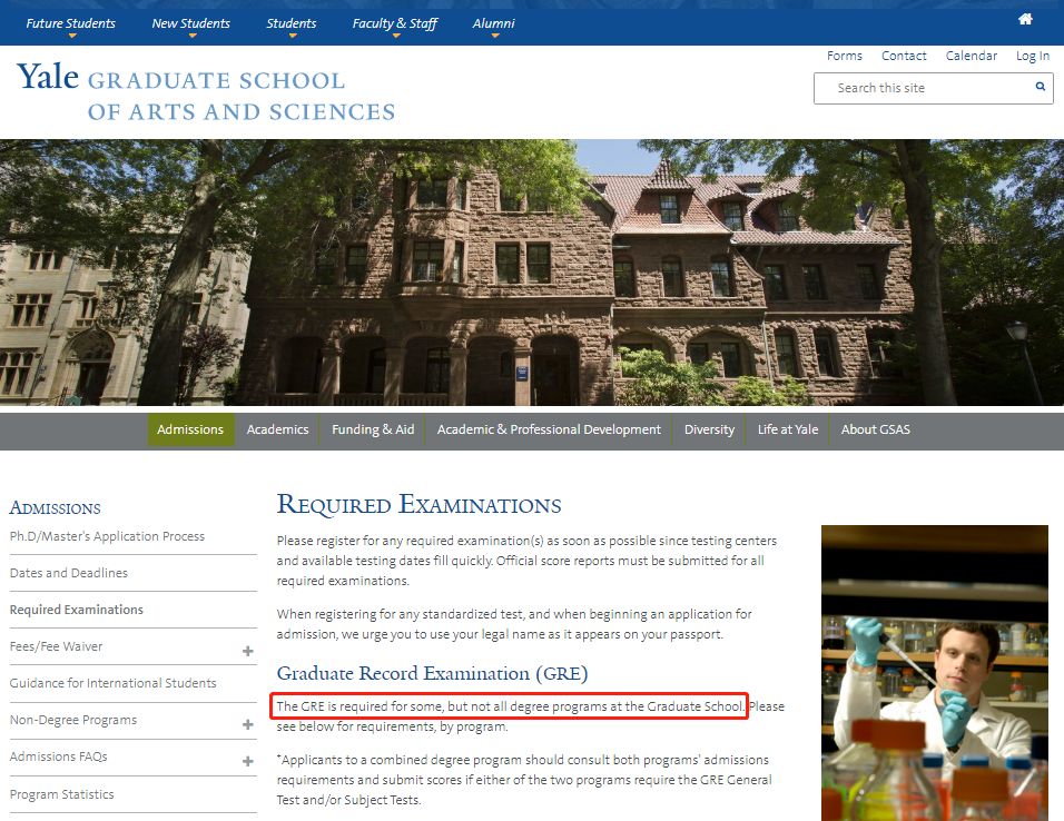 回到正题,GRE虽是入学考试,但很多学校官网并不会直接给出GRE要求分数,只是告诉你得提交。比如耶鲁大学研究生院,在官网招生公告中,只提到要求GRE成绩提交,却没有提及最低要求,那就只有参考前一年的录取数据了。