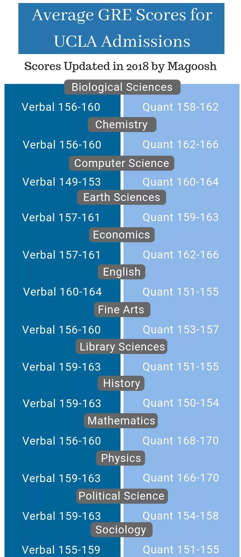 可以明显看出来,人文学科普遍对Verbal的要求高一些,比如社会学、教育学等等,相对应的这些学科对Quant的成绩要求就会低一些。根据各方信息显示,人文学科在录取的时候,往往分析性写作和Verbal的重要性相似,其实很好理解,因为比起理工科,文科专业研究生阶段是需要写很多逻辑严谨的论文。