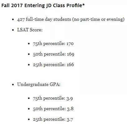 NYU的JD项目2017年入学427人,75百分位、中位、后25百分位GPA和LSAT分别为3.9/3.8/3.7和170/169/166。其中LSAT的要求相比2016年171/169/166在高分段的percentile下降了1分,而GPA则与2016年持平。与同处纽约市的哥大相比,GPA要求相对较高(哥大GPA:3.81/3.70/3.56),而LSAT要求略低(哥大LSAT:173/171/169)。