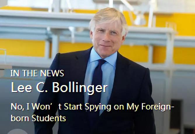 Lee C. Bollinger在《华盛顿邮报》周日评论版上发表题为《不,我不会开始监视我的学生》的文章中, 驳斥了FBI“鼓励”哥伦比亚大学设立渠道以及更为严苛的条例来监视国际学生,尤其是华人血统的学生和学者的要求,并表示: “这与第一修正案中的自由相悖。”