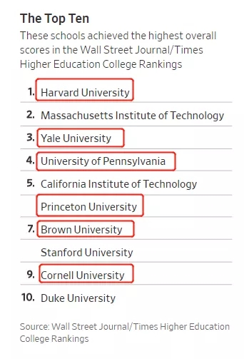 其中,常青藤学校(共8所,如下图所示)势头极猛, 在十强宝座里锁定了6个席位,足以见得它们在学术圈里稳固的名声和地位 。