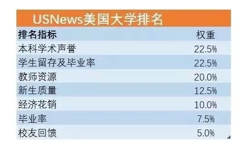 我们都知道, U.S. News 极为看重学术名声和师生质量,但是对学生离开学校后的成就却比较忽略 ,具体7个标准如下图所示: