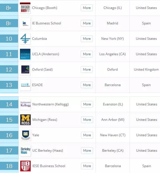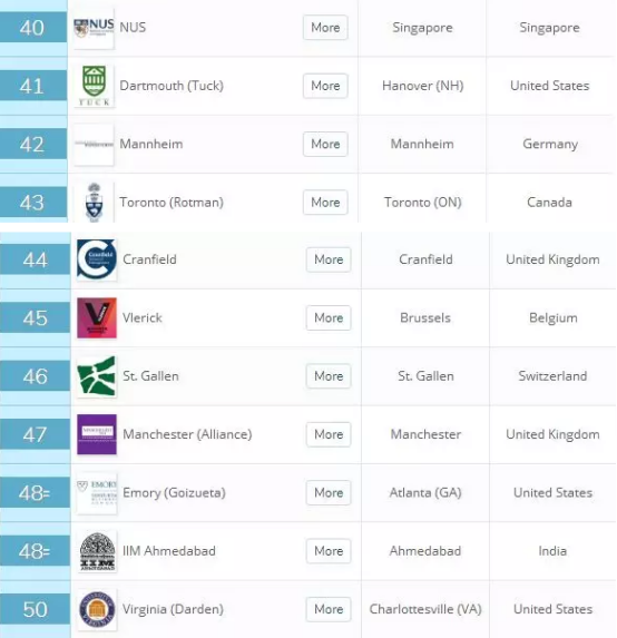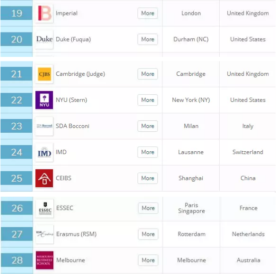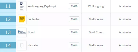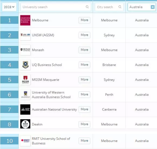 可以看出世界前50里共有两所澳洲高校,墨尔本大学位于第28名,新南威尔士大学商学院的 AGSM (澳大利亚管理研究院)跻身世界顶尖商学院第 39 位。