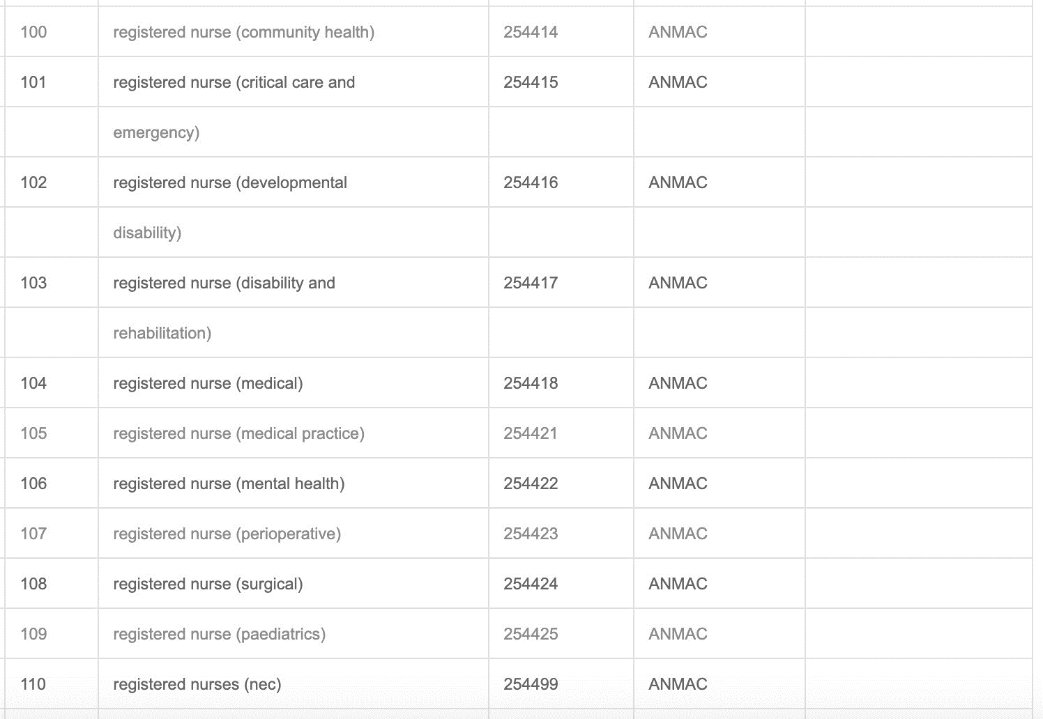 注意: 最后一条 “Register Nurses nec”,即“Not elsewhere classifie” 意思是指没有注明的其他任何类别注册护士。