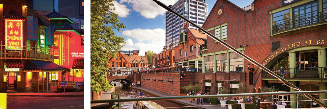 伯明翰是一个美丽和谐的城市:它既充满了现代化的勃勃生机,又因靠近一些美丽的田园乡村而使人能感受到心灵的宁静。如果您想放松惬意地打磨一天的时光,塞文河谷,马尔文山,铁桥峡谷(联合国教科文组织世界遗产)和风景如画的科兹沃尔德乡村都是不错的选择。如果您想探寻历史,你可以去参观伯明翰附近的华威城堡,凯尼尔沃思城堡,还有黑郡乡村生活博物馆。伯明翰周围还有一些远近闻名的小镇,比如莎士比亚的故乡埃文河畔斯特拉特福。