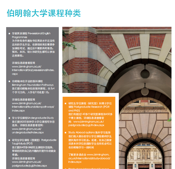 伯明翰大学,始建于1900年,是英国极具影响力的老牌名校,英国名校联盟“罗素大学集团”和国际大学组织Universitas21的创始成员之一。作为英国的第一所红砖大学,伯明翰大学以其卓越的教学质量与科研水平享誉全球。建校一百多年来,一直非常欢迎中国学生到伯明翰生活学习。
