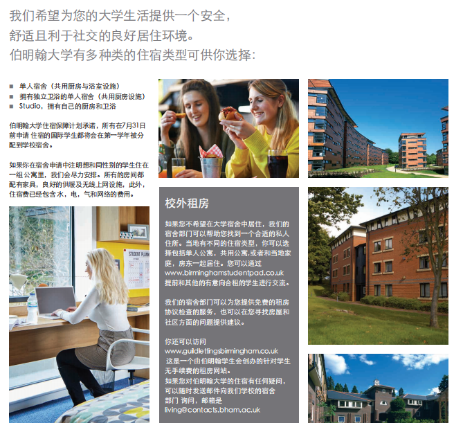 伯明翰大学占地276 英亩的校园被英国近期的《每日电讯报》评为英国十大最美校园,它将为您提供一个安全友好的的生活环境。在其中您将享受到各种先进的服务设施:咖啡馆,餐厅,理发店,商店,体育中心,3个银行,10个不同类型的图书馆以及学校自己的Barber 美术艺术馆,Lapworth地质博物馆和Winterbourne植物园。