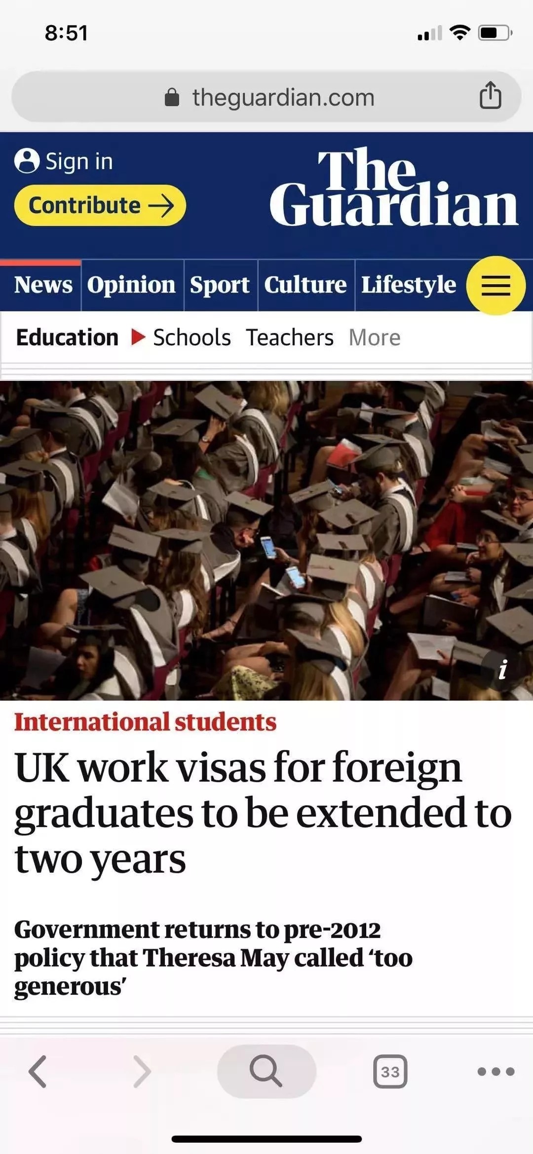卫报《英国将外国学生的工作签证延长至两年》