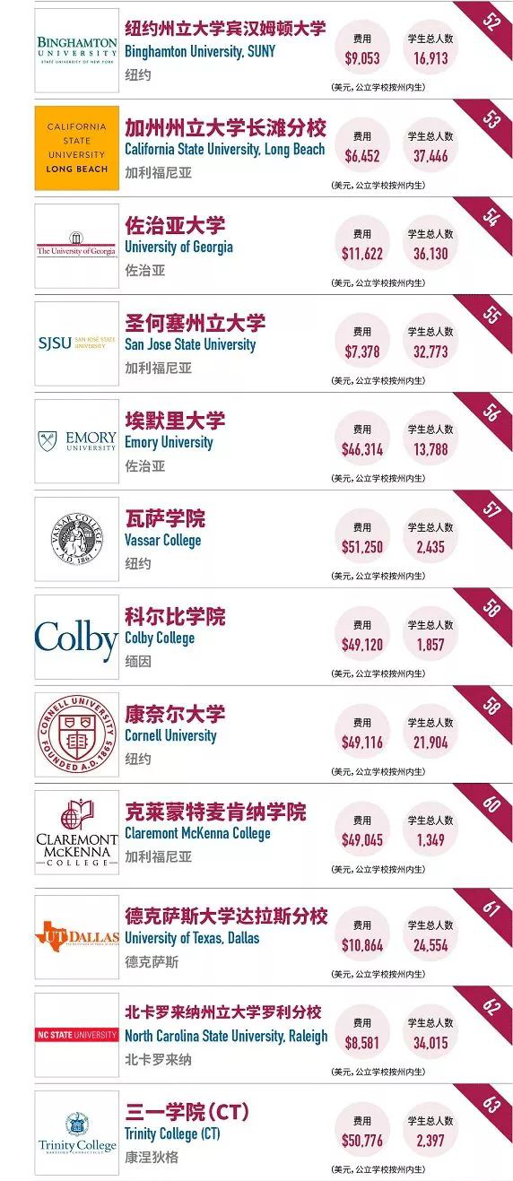 从官网排名的最新榜单来看,公立研究型大学占据榜单大部分席位 ( 共 166 所 ) ,然而私立大学和文理学院同样表现不俗,耶鲁大学排名第 14 位,威廉姆斯学院 (Williams) 排名第 15 位,波莫纳学院 (Pomona) 排名第 16 位,麻省理工学院排名第 17 位。杜克大学、达特茅斯学院 (Dartmouth) 和斯沃斯莫尔学院 (Swarthmore) 也在前 25 名之内。