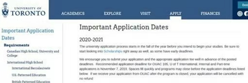 多伦多大学第一次明确表明2020年“早申请”的环节和截至日期。 建议申请的截至日期是2019年11月7日,而且没有提到材料截至日期。这就说明 最好雅思,高中成绩单以及面试等环节就要在这一天之前完成,而且还建议在这个截至日期前的一周递交。