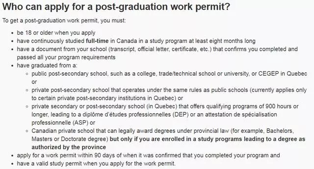 2008年4月,移民局修改了毕业工签的规定,凡是在加拿大政府指定的公立学校或私立学校完成至少8个月以上的课程并获得相应的高中以上学历,即可申请获得开放式(不限雇主)的工作签证,这就是传说中的毕业工签(Post-grauation work permit)。