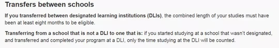 转学生从加拿大移民局认可院校的学校(Designate Learning Institution)转入另一所DLIs校,就读总时长必须超过8个月。