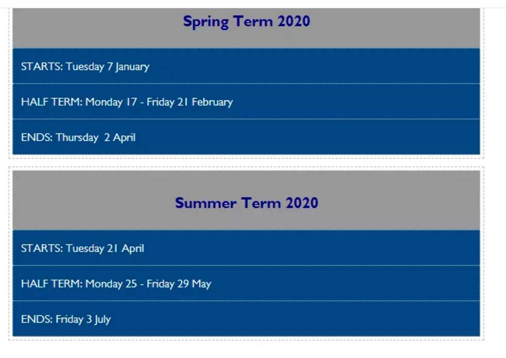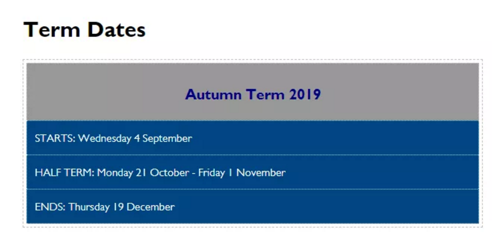 比如说,英国预备学校Warwick Preparatory School的学期安排,秋季9月开学,10月底一周假期,12月底第一学期结束: