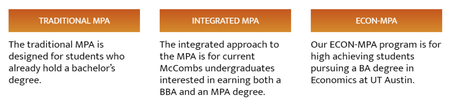 其会计专业设置在商学院下面,根据不同的人群会计专业分为三个类型,传统一年的会计专业,不限制专业背景,不要求工作经验。The integrate MPA 适用于本校的学生,ECON-MPA是专为在德克萨斯大学奥斯汀分校攻读经济学学士学位的优秀学生设计的。
