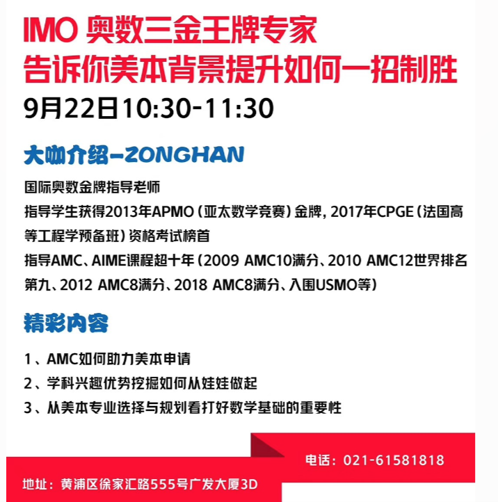 既然AMC含金量呢如此高,那如何找到专业人士去了解和学习呢?本周日9月22日上午10点半,奥数三金王牌老师告诉你,现在怎么走近AMC!
