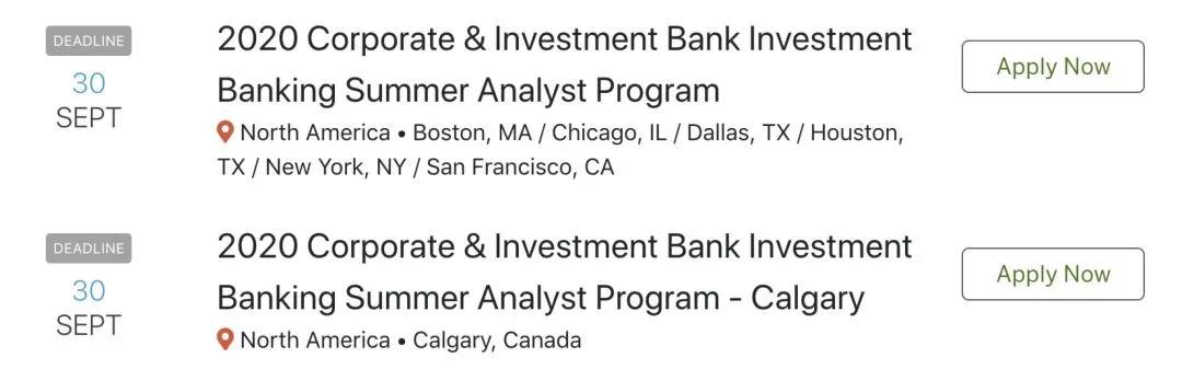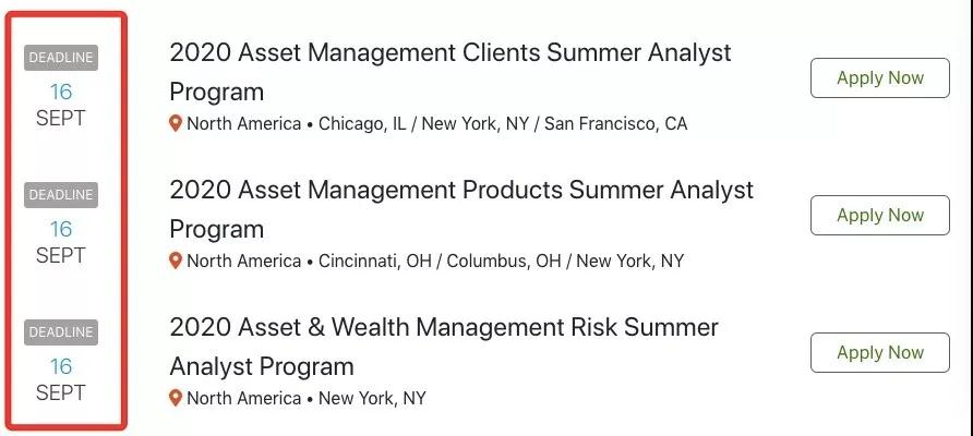 除了开头提到的IBD,还有 Risk Management / Wealth Management / Quantitative Research / Asset Management 等,其中部分项目 9月16日 就将截止申请,速度!