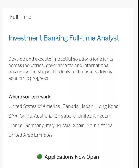 现在,我们就来为大家盘点一下JP Morgan目前仍然可申请的岗位,以及不同网申类型的介绍,同学们可以自身条件选择项目申请。