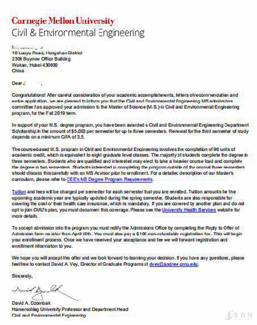 录取专业:Master of Science (M.S.) in Civil an Environmental Engineering