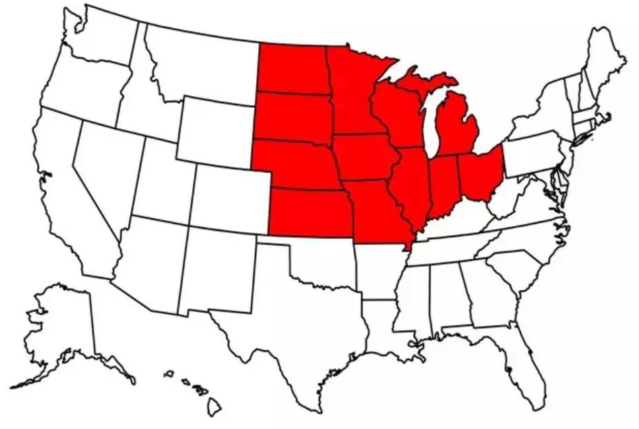 今天我们主要讨论美国中西部,该区域被称为 美国的地理中心! 美国中西部包括 伊利诺伊州、印第安纳州、爱荷华州、堪萨斯州、密歇根州、明尼苏达州、密苏里州、内布拉斯加州、北达科他州、俄亥俄州、南达科他州、威斯康星州。