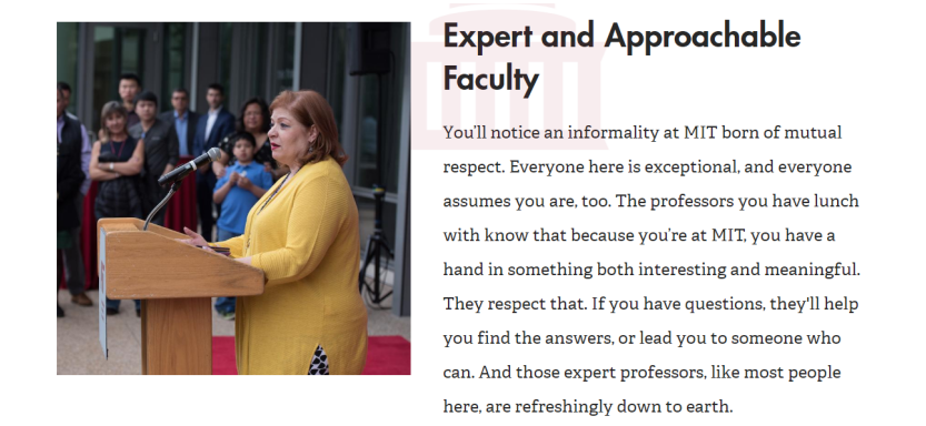 你会发现麻省理工学院的非正式性源于相互尊重。这里的每个人都很特别,每个人都认为你也是。你和午餐的教授都知道,因为你在麻省理工学院,你有一个既有趣又有意义的东西。他们尊重这一点。如果您有疑问,他们会帮助您找到答案,或引导您找到可以的人。那些专家教授,就像这里的大多数人一样,令人耳目一新。