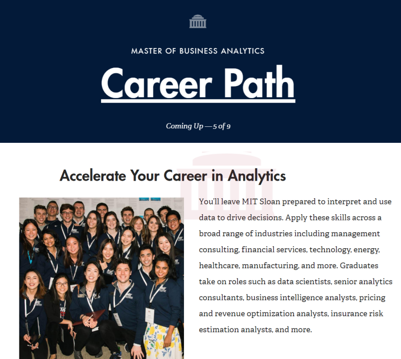 您将离开MIT Sloan准备解释和使用数据来推动决策。将这些技能应用于广泛的行业,包括管理咨询,金融服务,技术,能源,医疗保健,制造等。毕业生担任的角色包括数据科学家,高级分析顾问,商业智能分析师,定价和收入优化分析师,保险风险评估分析师等。