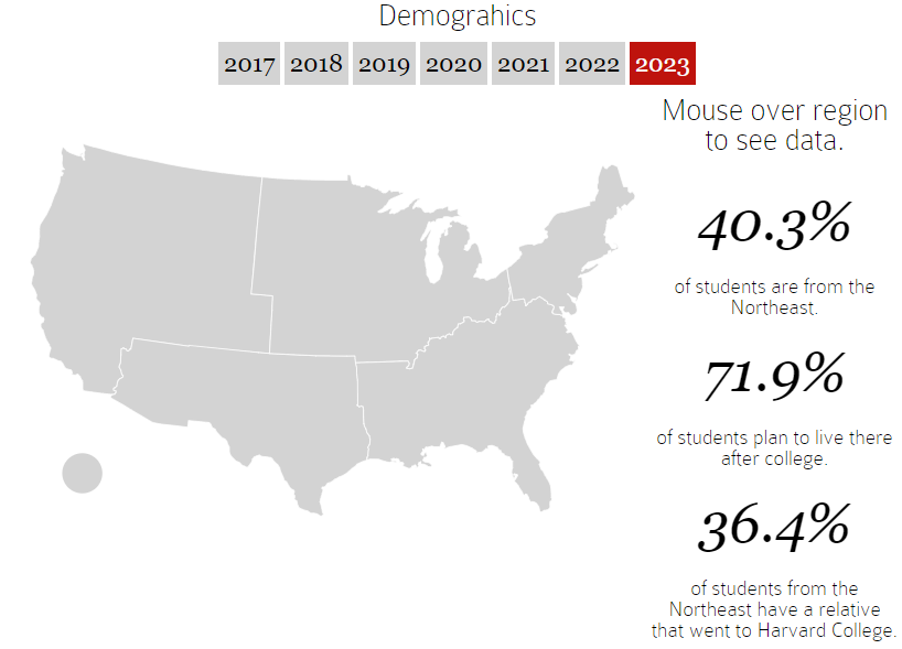 来自东北部的学生中有71.9%计划毕业后留在东北部,其中有 36.4%的学生家庭是哈佛校友。 来自西部的学生中有11.9%计划毕业后留在西部,其中有33.3%的学生家庭是哈佛校友。来自美国以外的学生中有9.6%计划毕业后留在自己国家,其中有11.8%的学生家庭是哈佛校友。