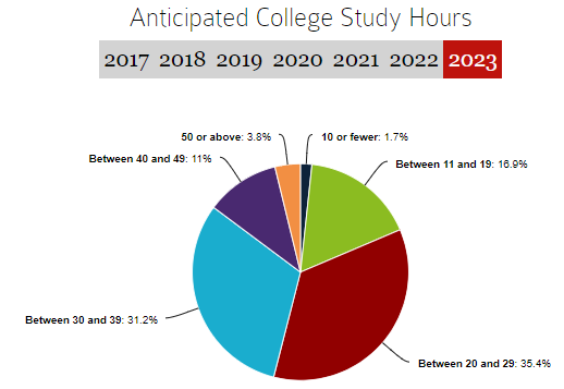 受访者 在高中学习的 时长与他们预期在大学学习的时长之间存在显着关联。一般来说,学生们表示他们希望在大学里学习的内容比在高中时更多。例如,所有在高中每周学习11到19个小时的受访者,都希望在哈佛大学学习至少相同的时间。85%的受访者预计在大学 每周学习20个小时或更长时间。