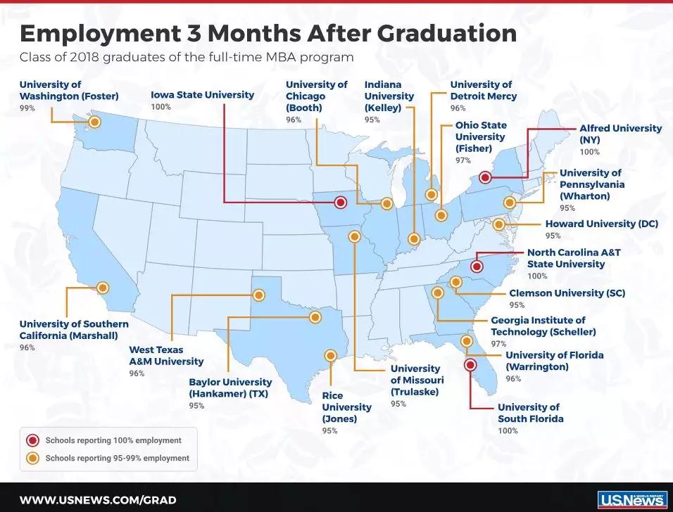 另外,获得高薪的 MBA 工作往往需要耐心,毕业生工资最高的学校不一定是就业最快的学校。对比全美毕业三个月就业率最高的 13个项目中,有 9个在公立学校。据 U.S.News 调查的 131个全日制 MBA项目中,2018年毕业生毕业三个月就业率为 84% 。