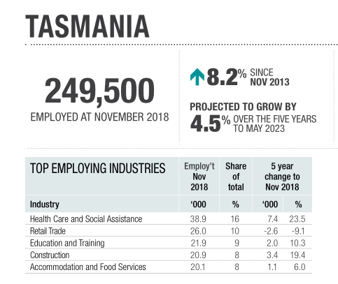 塔斯马尼亚州可以说是工作机会最少的州了。但是塔州地区的工作也是最多样化的,55%的工作位于霍巴特以外。过去五年的就业增长率略低于全国平均水平。新增就业岗位最多的有: