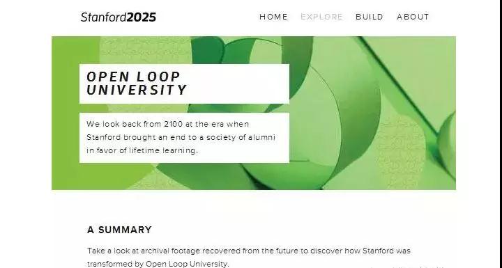 斯坦福大学的 2025 计划 Open-loop University 开环大学将彻底颠覆全世界的高等教育模式。在注重实用的教育理念牵引下,斯坦福大学敢想、敢为,不断创新、突破,甚至是颠覆。即使在创业教育取得丰硕成果和良好国际声誉的情况下,斯坦福大学仍然在 “ 教育新时代 ” 下对未来教育模式进行了崭新的再造,这就是《斯坦福大学 2025 计划》的由来。