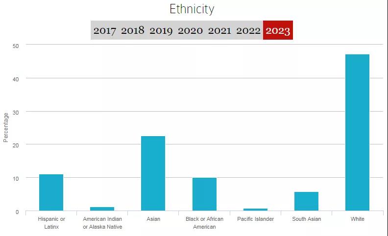 2023届新生中,白人学生占比47%,11%为拉丁裔,10%为非洲裔,亚裔学生占比超过22%,依然是第二大生源组成。