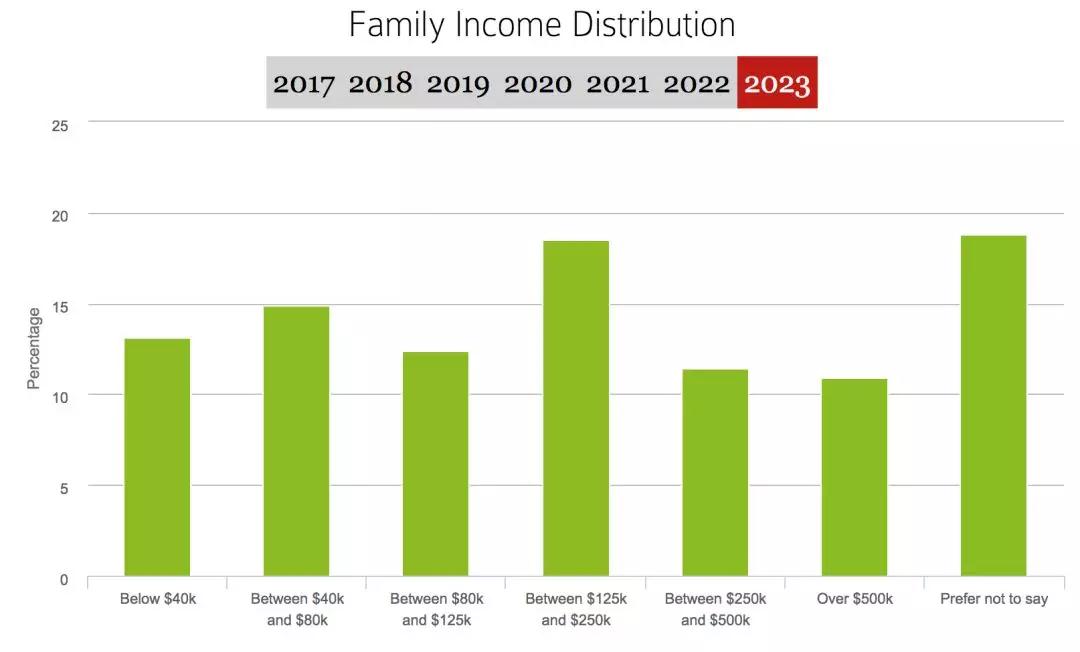 其中,30%的学生家庭收入背景在125K到500K之间。家庭收入40K以下的仅占13%。家庭收入500K以上的学生逐年增加,今年最高达到18%。