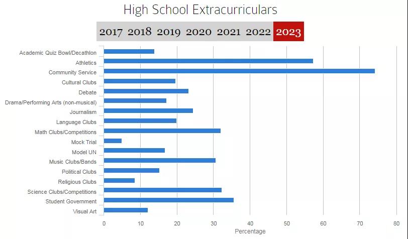 74%的受访者表示, 最受欢迎的高中课外活动是社区服务;其次,是体育运动, 参加学生人数占57%;剩下的分别是,学生会占36%,数学俱乐部占32%,科学俱乐部占32%,音乐团体占31%。