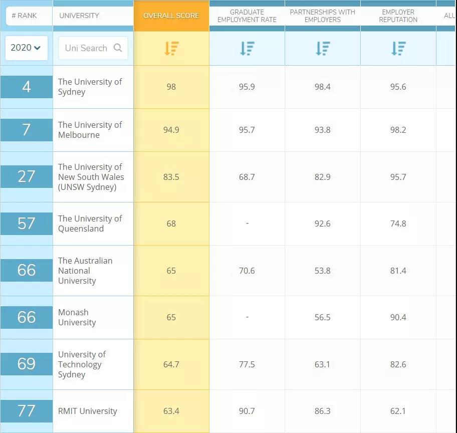 悉尼有悉尼大学,墨尔本也不甘落后,推出了王牌——墨尔本大学。作为澳洲八大之一,维州的龙头高校,墨大拿到了第7名的高位,毕业生一样能打,还胜过了剑桥大学(8)、牛津大学(10)、北京大学(19)等全球顶尖学府。 新南威尔士大学全球排名27,全澳第三,而且在校友成果这项上拿到了澳洲的最高分。 昆士兰大学排名澳洲第4位,全球排名第57位。 同为澳洲八大之一的澳洲国立大学和蒙纳士大学并列全球第66位。 接下来两所高校都是在QS综合排名中不显山不露水的,但其就业力排名超出众人想象。 黑马悉尼科技大学不仅学术排名每年在上升,就业排行榜的名次也颇高,位列全球第69。 皇家墨尔本理工大学(RMIT)本次排名第77名,是澳洲排名提升幅度最大的学校,比去年足足提高了8位!为进步 王 皇鼓掌!